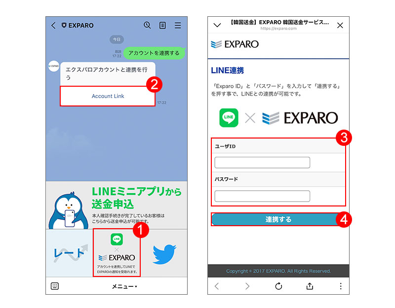 - 1エクスパロ公式LINEのROOMに表示されているメニューのアカウント連携ボタンを押してください