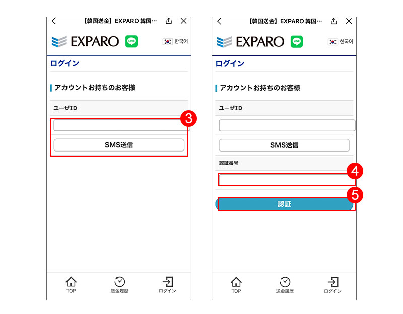 - 3EXPAROのユーザIDを入力して、「SMS送信」ボタンを押してください