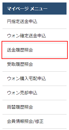 会員マイページメニューから[送金履歴照会]ボタンをクリックするとこれまでに送金申込した履歴が全件表示されます。