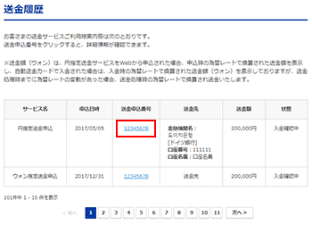送金履歴ページのリストからキャンセルしたい送金申込番号をクリックすると、申込内容詳細が表示されます。