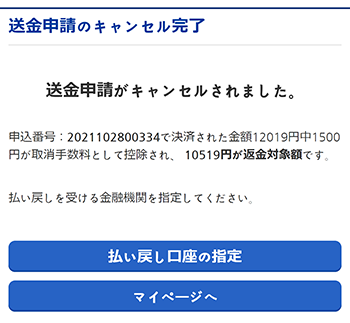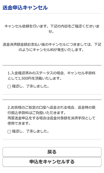 送金ステータスが、「入金確認済み」の場合、キャンセル手数料が発生します。