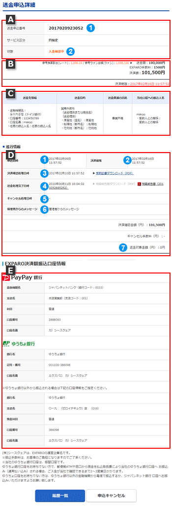 送金完了日時:申込の送金先に送金取り組みが完了した日時が表示されます。
