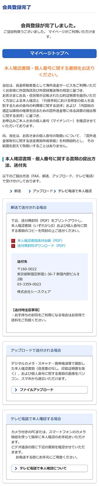 10万円を超える韓国送金をご利用頂く為には、会員登録と本人確認手続きが必要です。