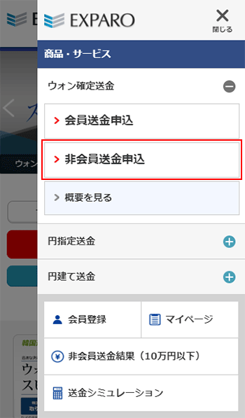 メニューボタンから[ウォン確定送金]⇒[ゲスト会員送金申込]をクリックします。