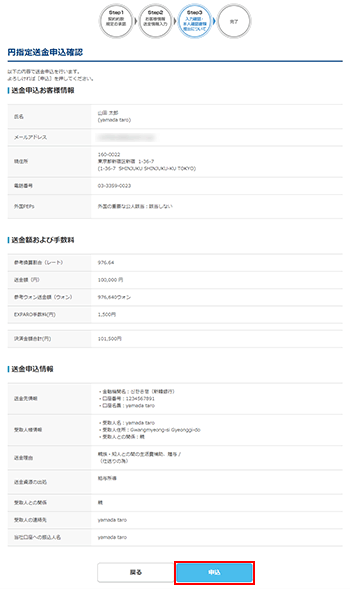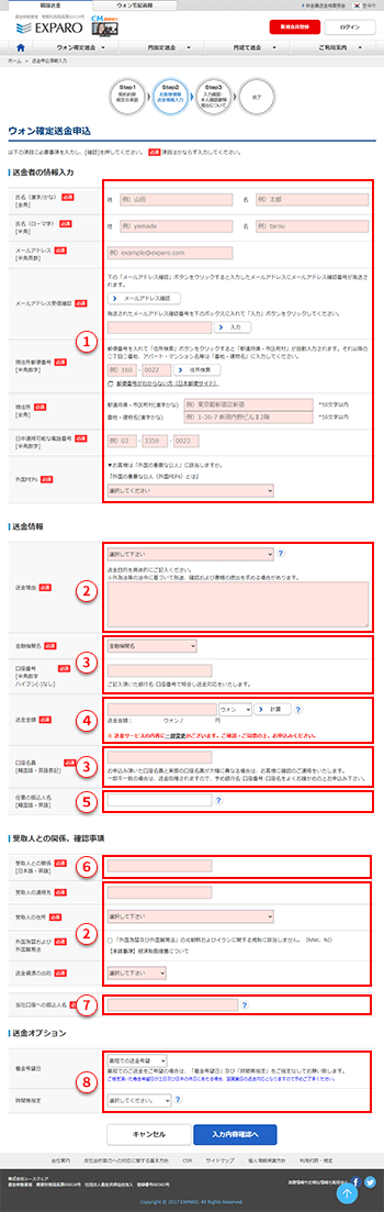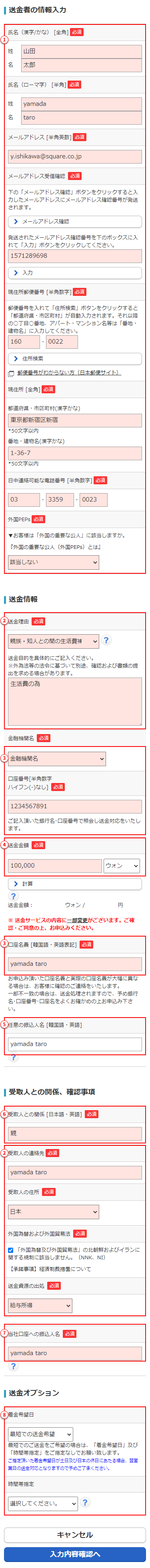Step2お客様情報およびウォン確定送金申込内容のご入力