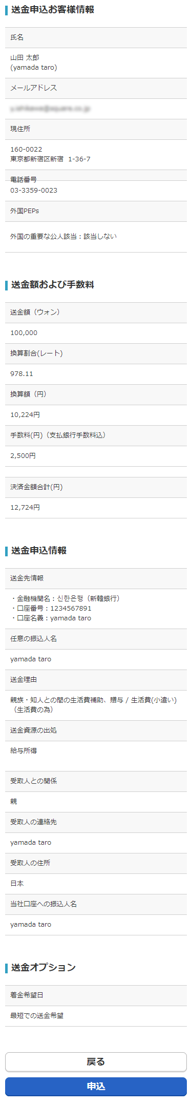 ゲスト会員ウォン確定送金申込フォームにお客様情報、送金金額、送金先金融機関情報等を入力のうえ、申込を完了して下さい。 送金申込情報が正常に送信された場合、ご入力いただいたメールアドレス宛に送金申込確認自動メールが送信されますので必ずご確認ください。