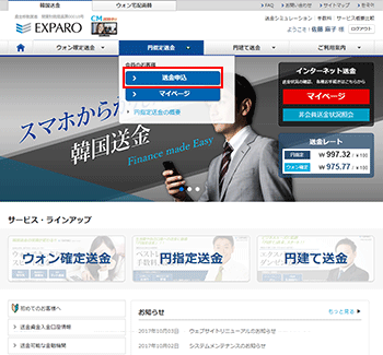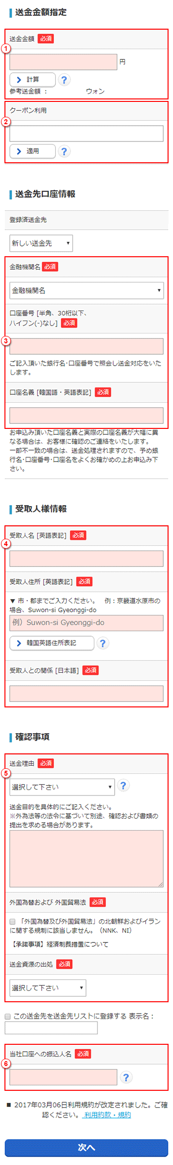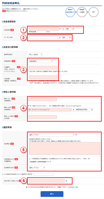 送金金額を日本円でご指定ください。送金処理時に韓国ウォンに換算し、送金致します。