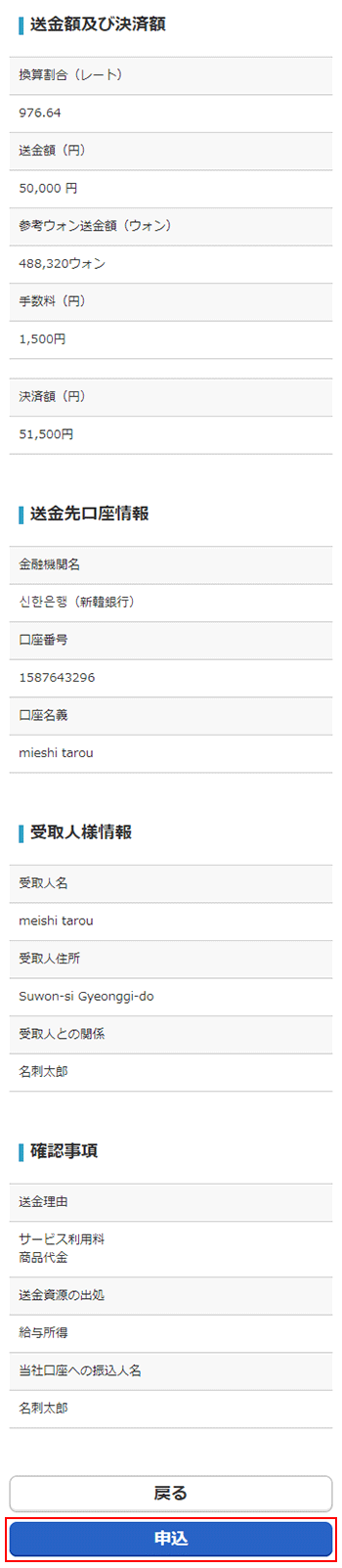 送金申込内容に間違いがないかご確認ください。 誤りがなければ[申込]ボタンを押します。