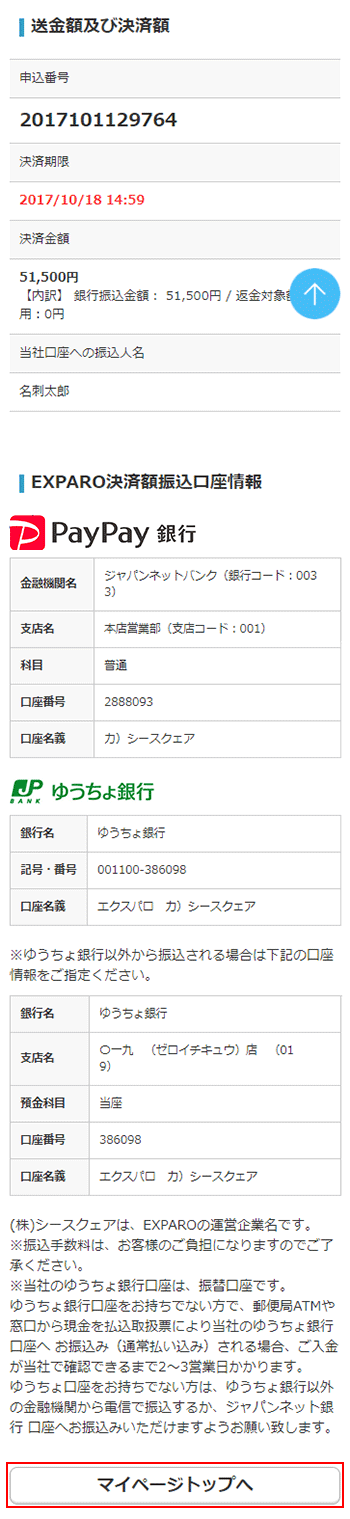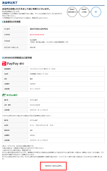 決済期限までにエクスパロ指定口座へ決済金額(送金金額+手数料)をお振込ください。