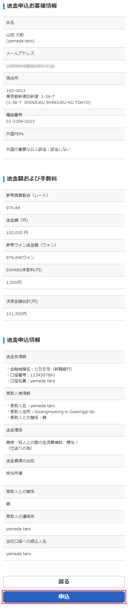 送金申込内容に間違いがないかご確認ください。