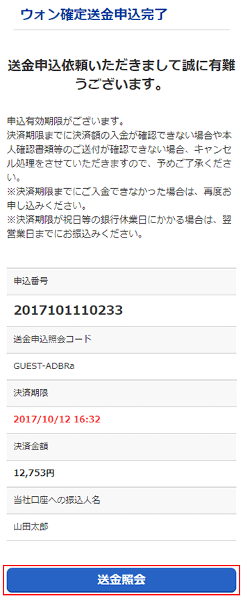 送金申込の画面を表示(ゲスト会員)