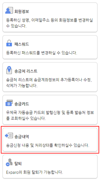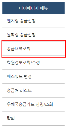 회원 마이페이지 메뉴에서 [송금내역조회]를 눌러주세요.