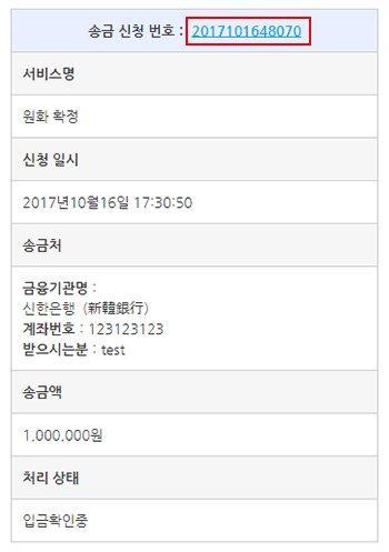 - 송금처리 시 적용된 환율이 표시됩니다.
