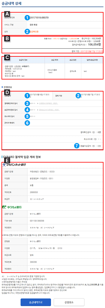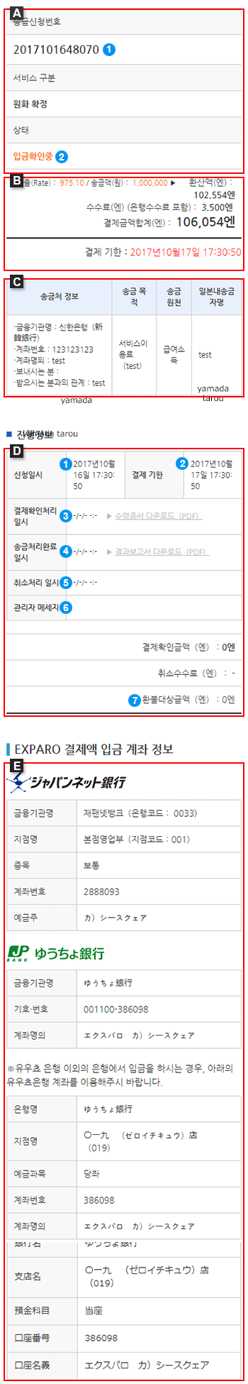 송금자금을 입금하시는 국내(일본) EXPARO 계좌가 표시됩니다.
