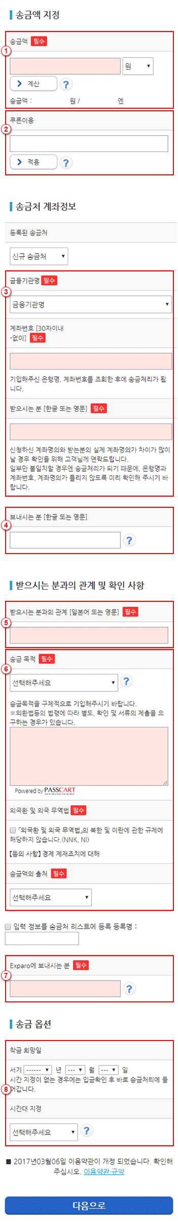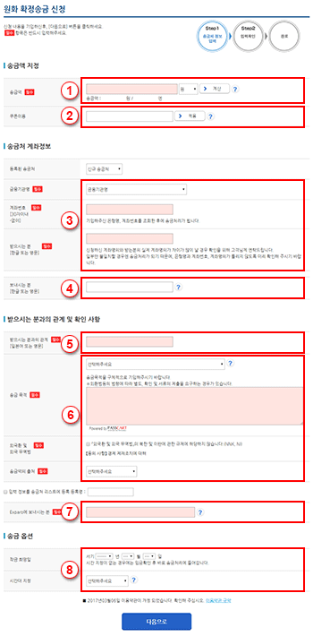 송금액, 송금처정보 등을 원화 확정 송금신청 폼에 맞게 입력해 주시기 바랍니다.