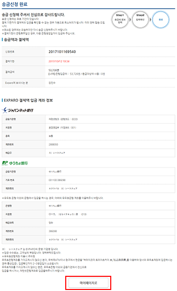 결제기한까지 폐사 지정의 계좌로 결제금액(송금금액+송금 수수료)를 입금해주시기 바랍니다. 입금확인이 되면, 고객님이 등록하신 메일 주소로 입금확인 메일이 자동 송신됩니다. 또는, 마이페이지에서 입금확인 상태를 확인하실 수 있습니다.
