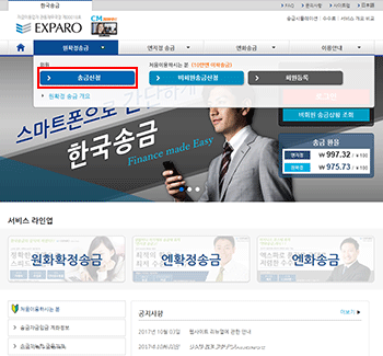 메인페이지 또는 서비스 소개 페이지 등의 메뉴에서 「원화 확정 송금신청」>[비회원 송금신청]을 눌러주세요.